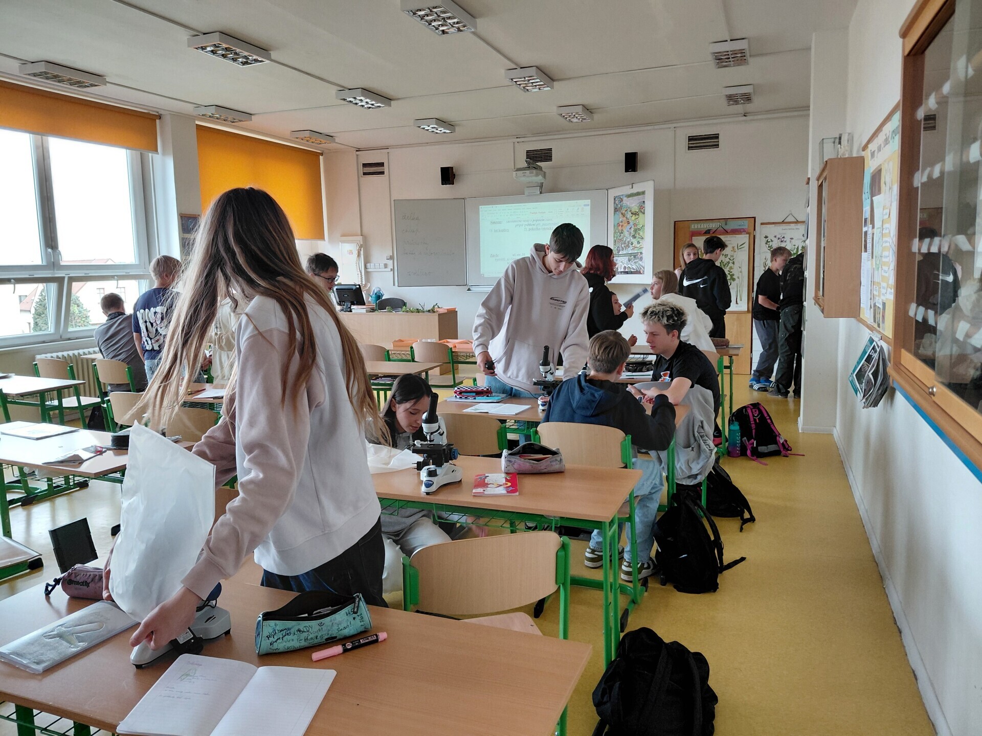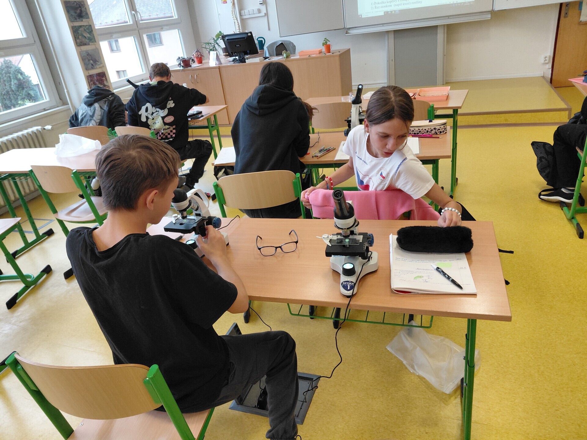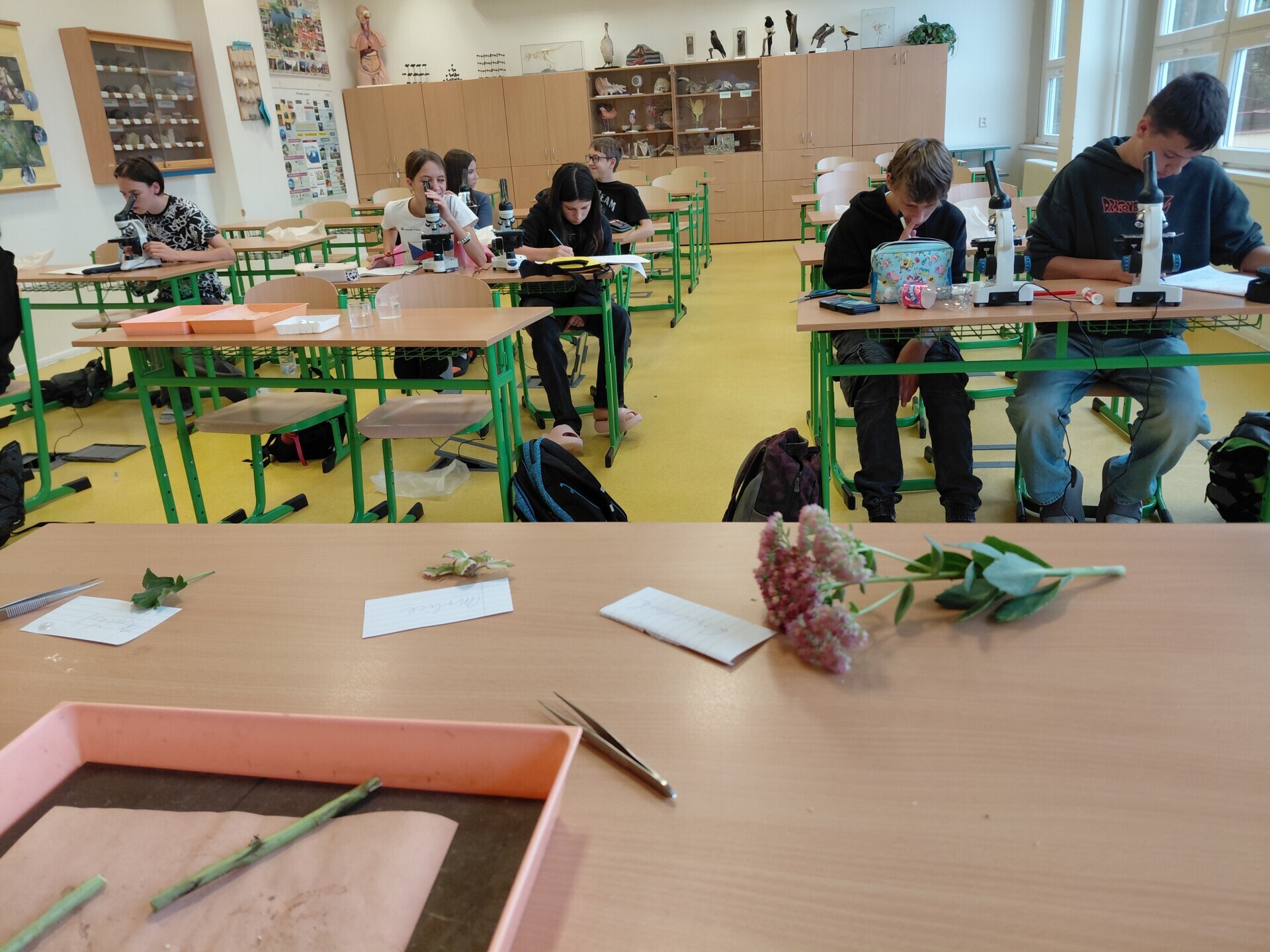 V hodinách přírodopisu se osmáci učí o vnitřní stavbě těla rostlin. Protože je složité si rostlinu zevnitř představit, tak jsme během přírodopisu a také ekologických praktik mikroskopovali. Ukázali jsme si žahavé trichomy kopřivy, průduchy v pokožce rozchodníku, průřez stonkem. Porovnávali jsme síťnatou žilnatinu kopřivy a souběžné žilky v listu trávy. Podívejte se také. Blaž