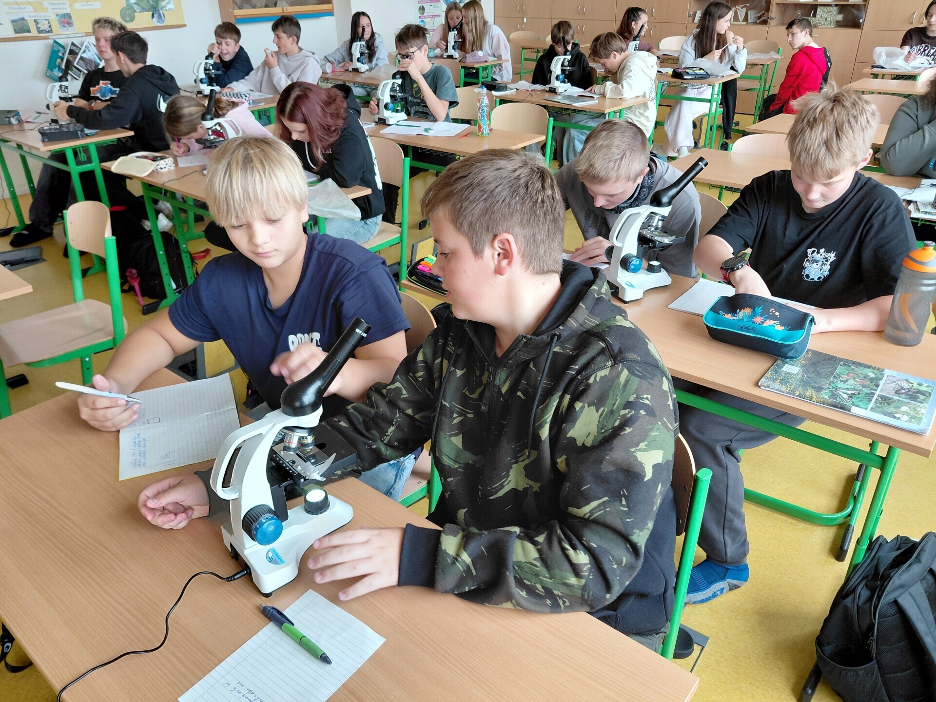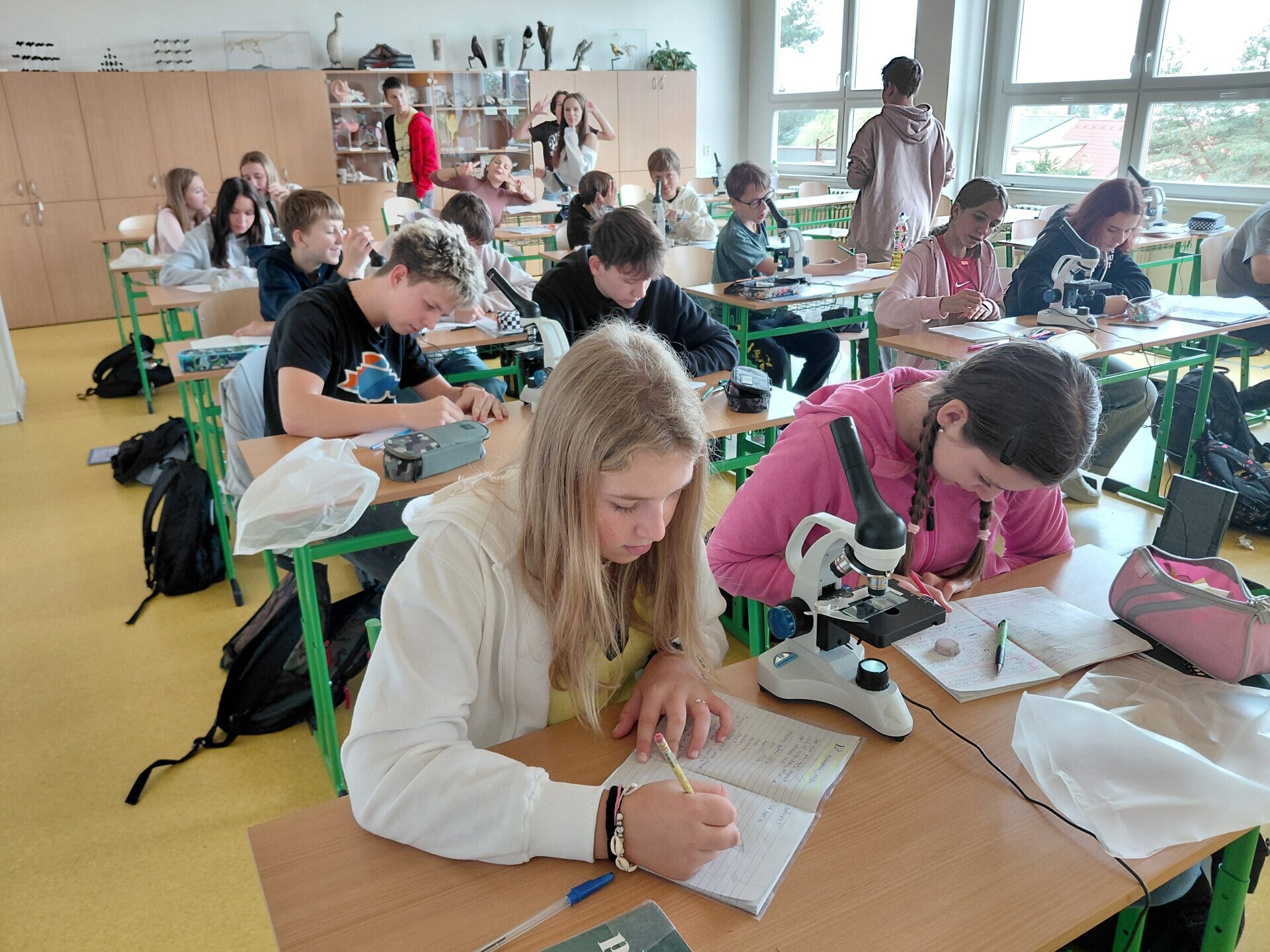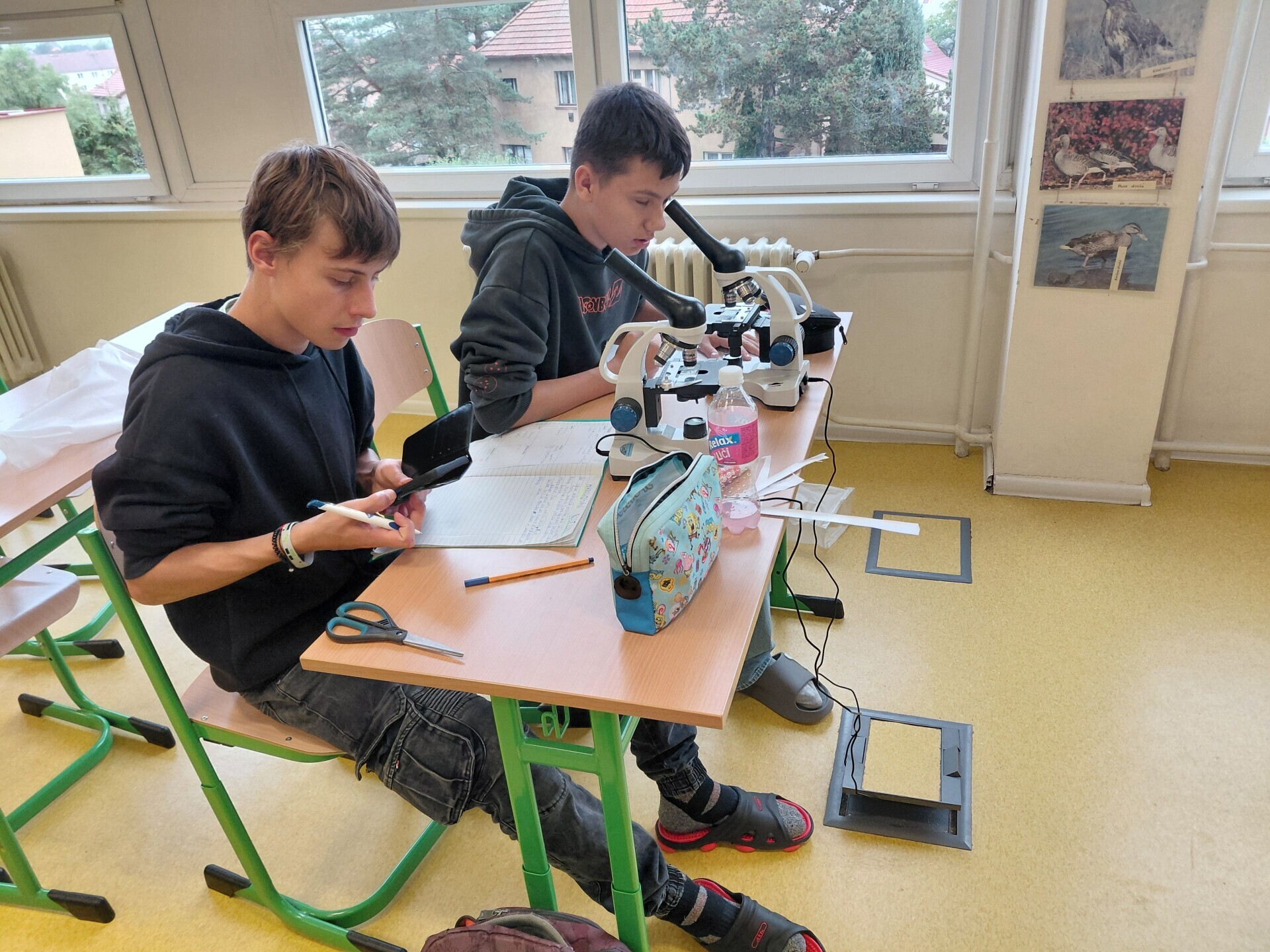 V hodinách přírodopisu se osmáci učí o vnitřní stavbě těla rostlin. Protože je složité si rostlinu zevnitř představit, tak jsme během přírodopisu a také ekologických praktik mikroskopovali. Ukázali jsme si žahavé trichomy kopřivy, průduchy v pokožce rozchodníku, průřez stonkem. Porovnávali jsme síťnatou žilnatinu kopřivy a souběžné žilky v listu trávy. Podívejte se také. Blaž