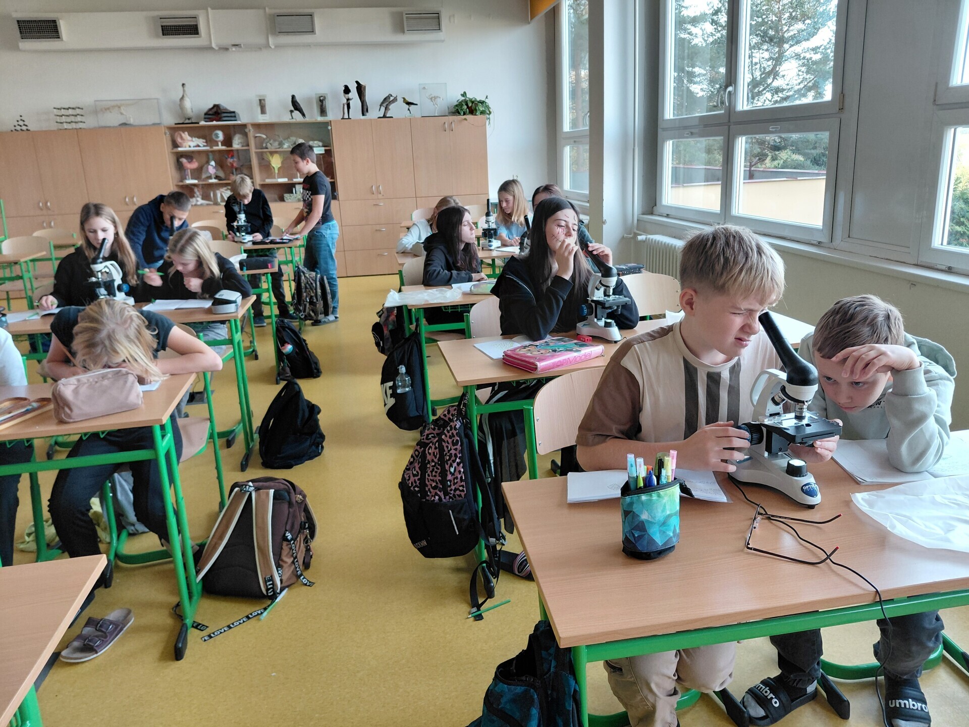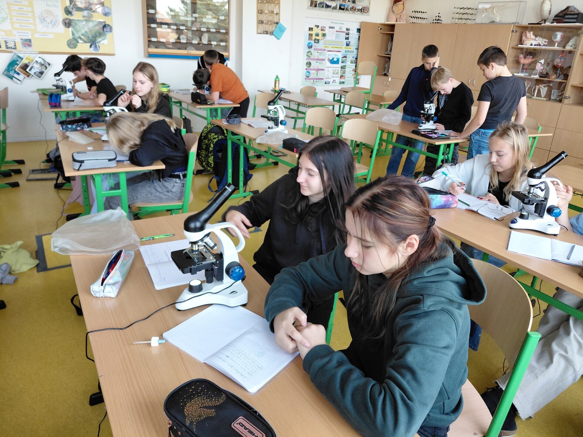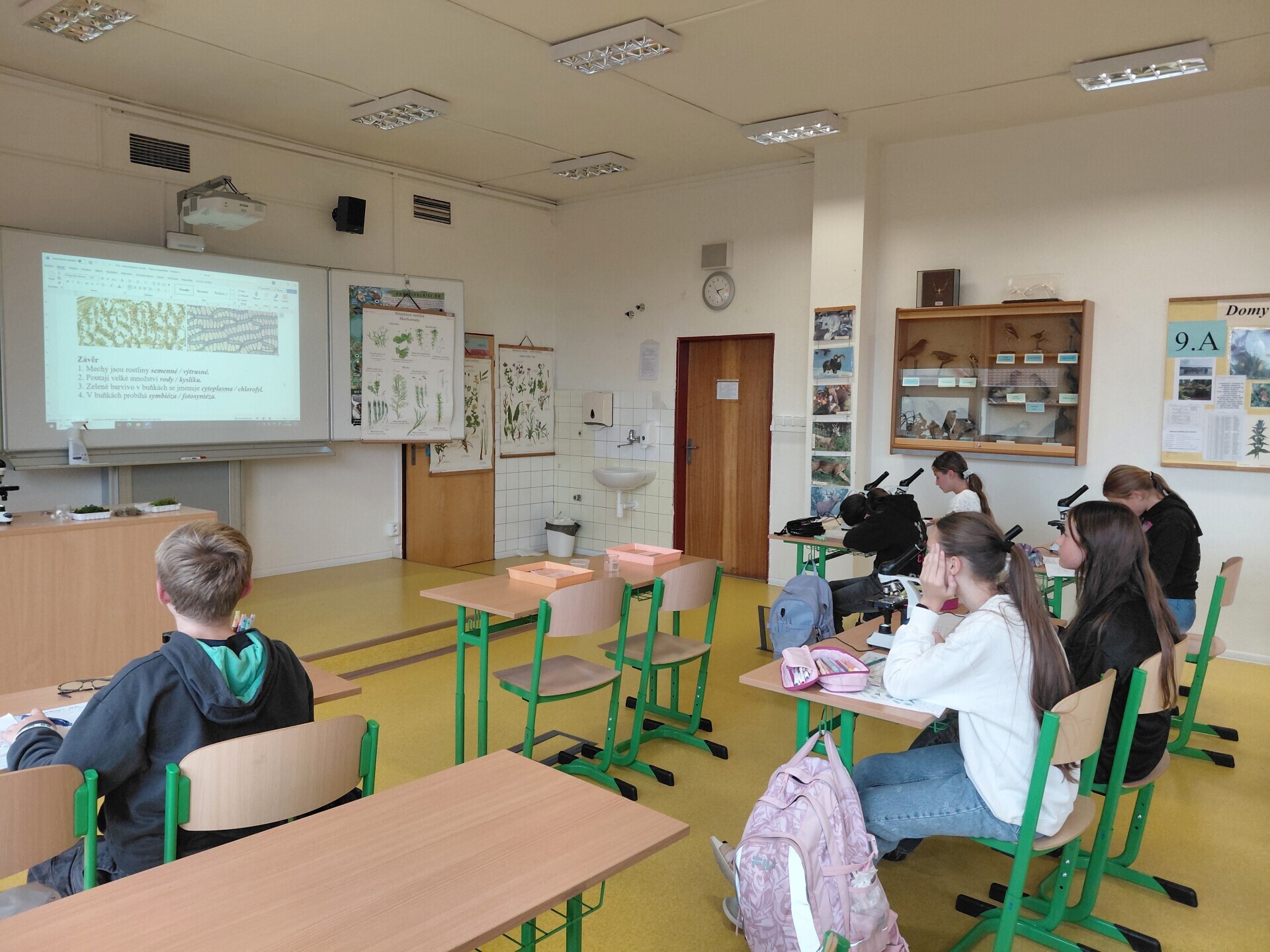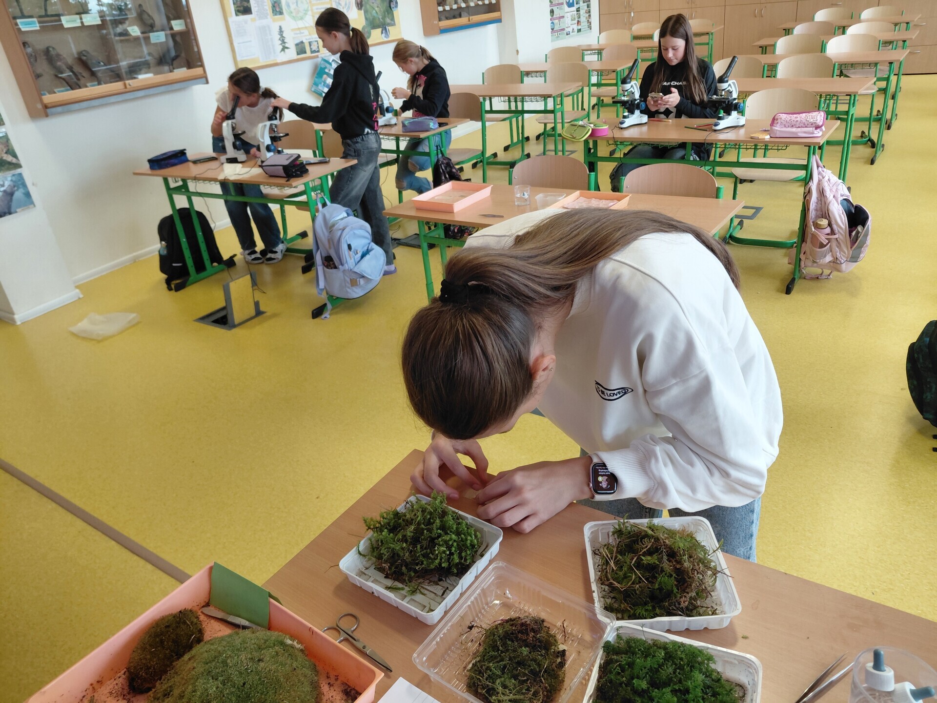 Jak v hodinách přírodopisu se 6.B, tak v ekologickém praktiku 6.r. jsme poznávali mechy. Vyzkoušeli jsme, že i malý kousek mechu zadrží velké množství vody a zadržování vody je i hlavní význam mechů v krajině. Nejvíce děti bavilo mikroskopování, při kterém si prohlédly buňky mechů, pozorovaly jednotlivé části buněk i odlišnosti druhů mechů. LB