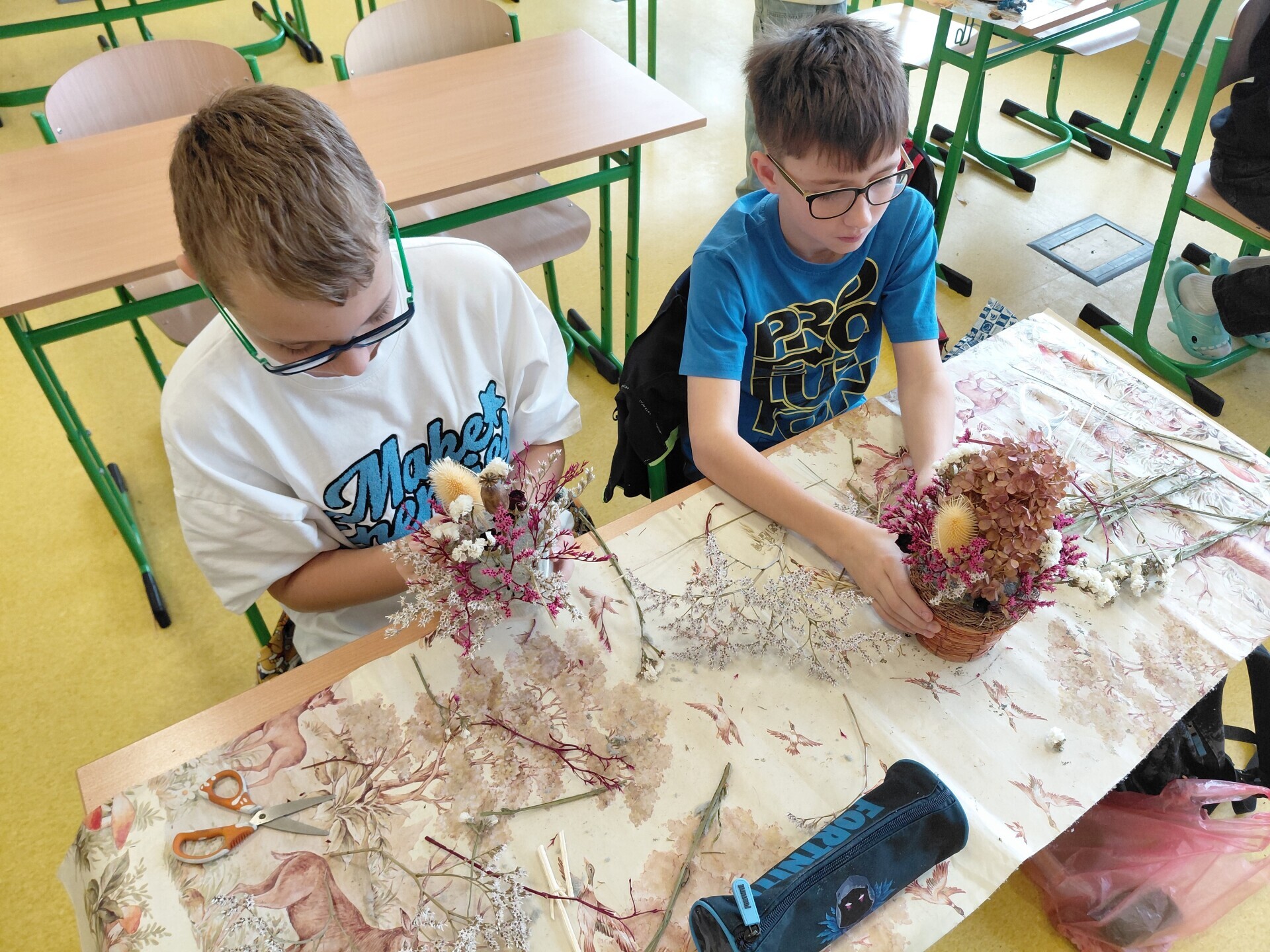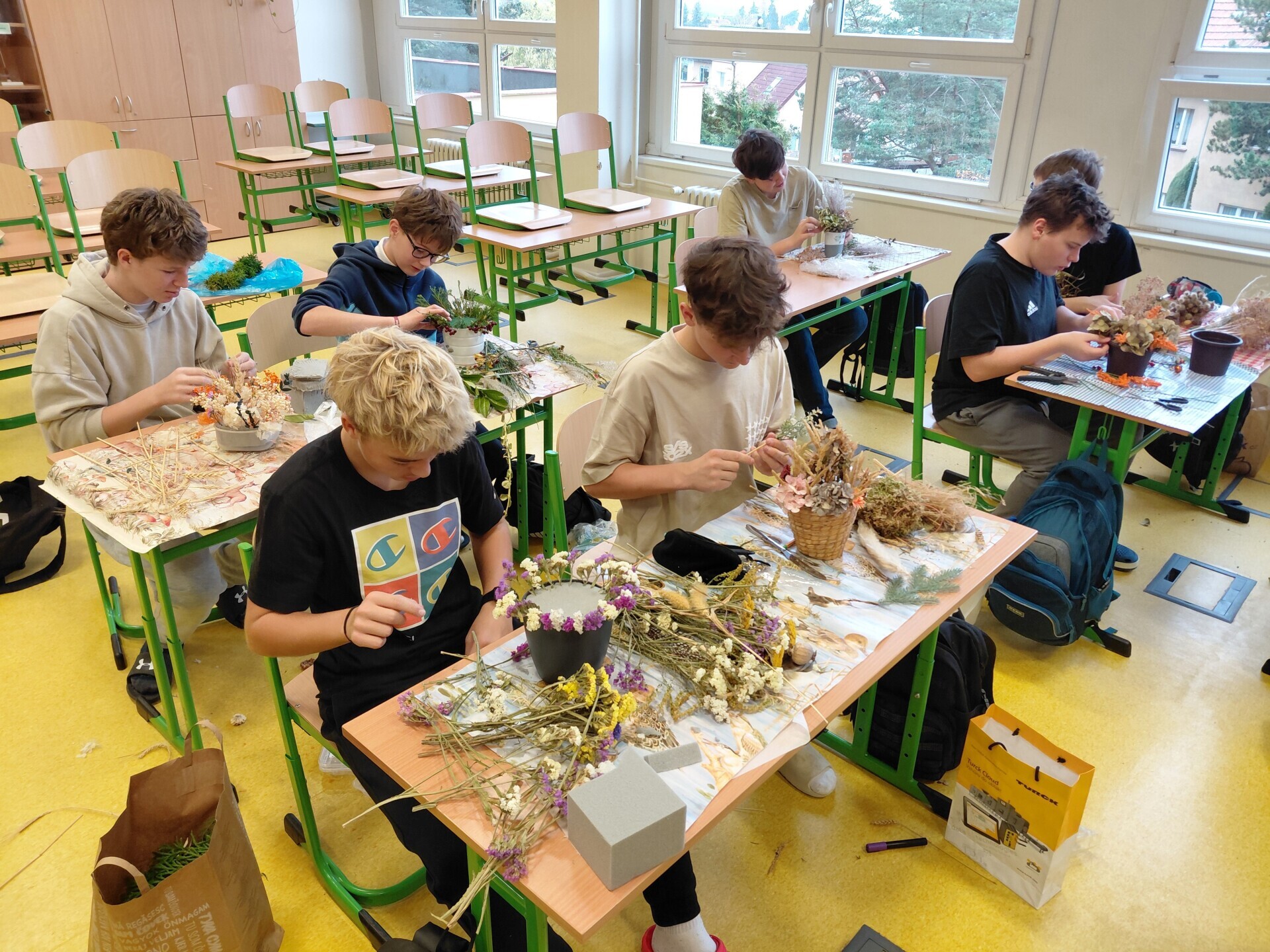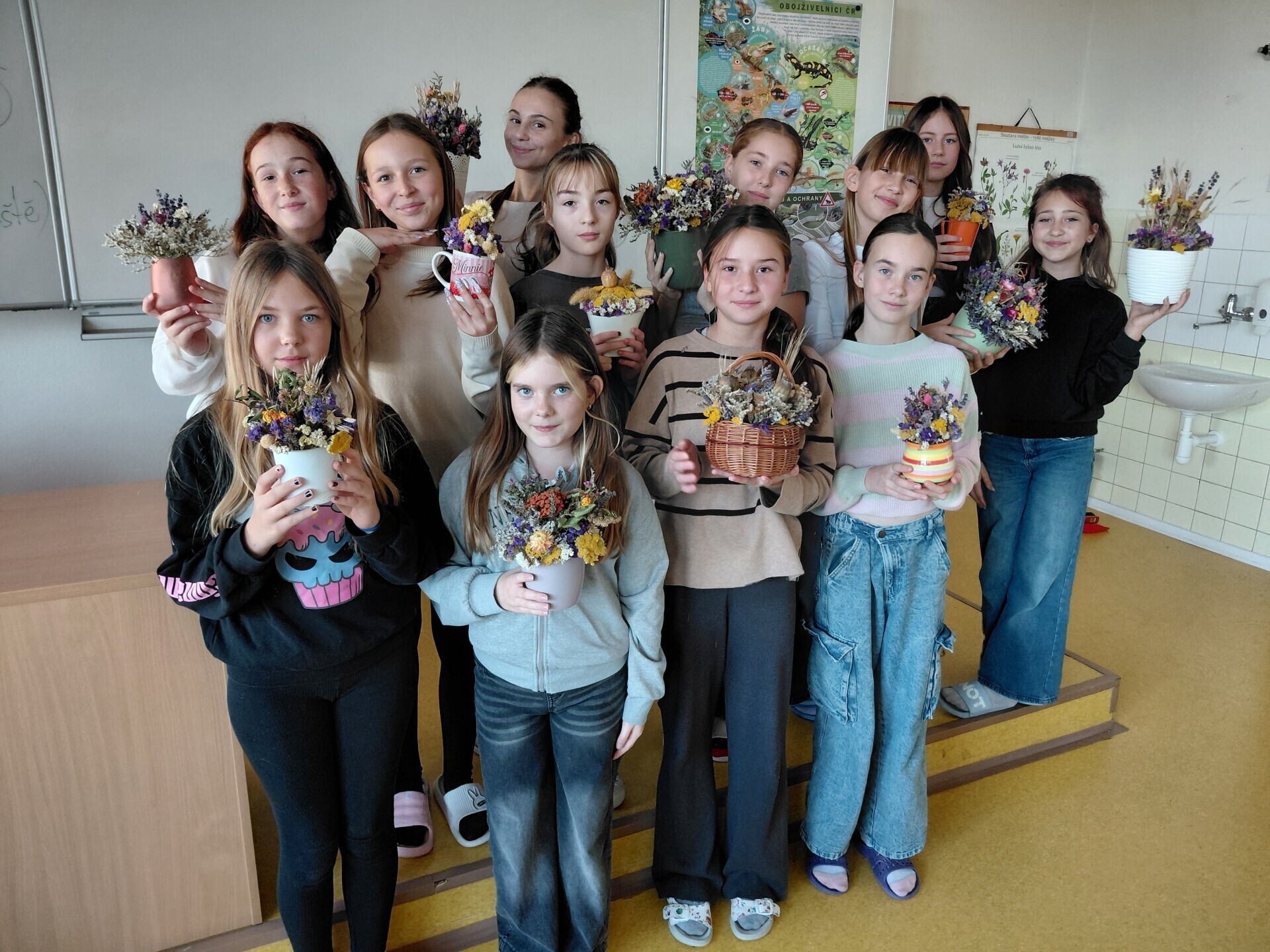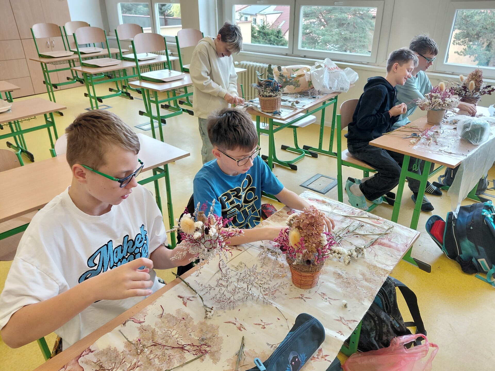 Během listopadu se děti v hodinách pěstitelství učily aranžovat sušené květiny. Seznámily se s druhy vhodnými k aranžování a s principy aranžování. Povedly se jim pěkné aranže tzv. suché vazby. LB