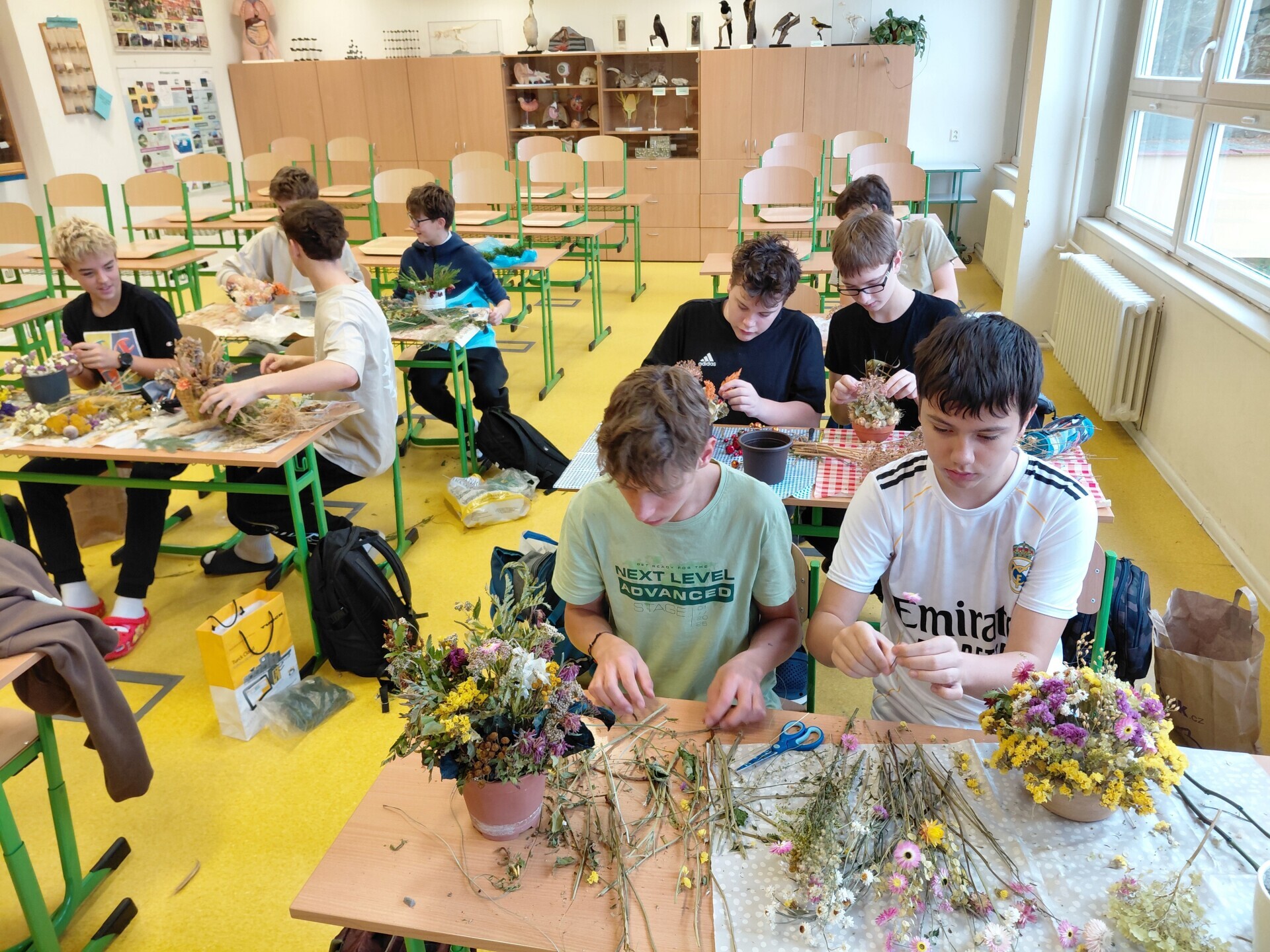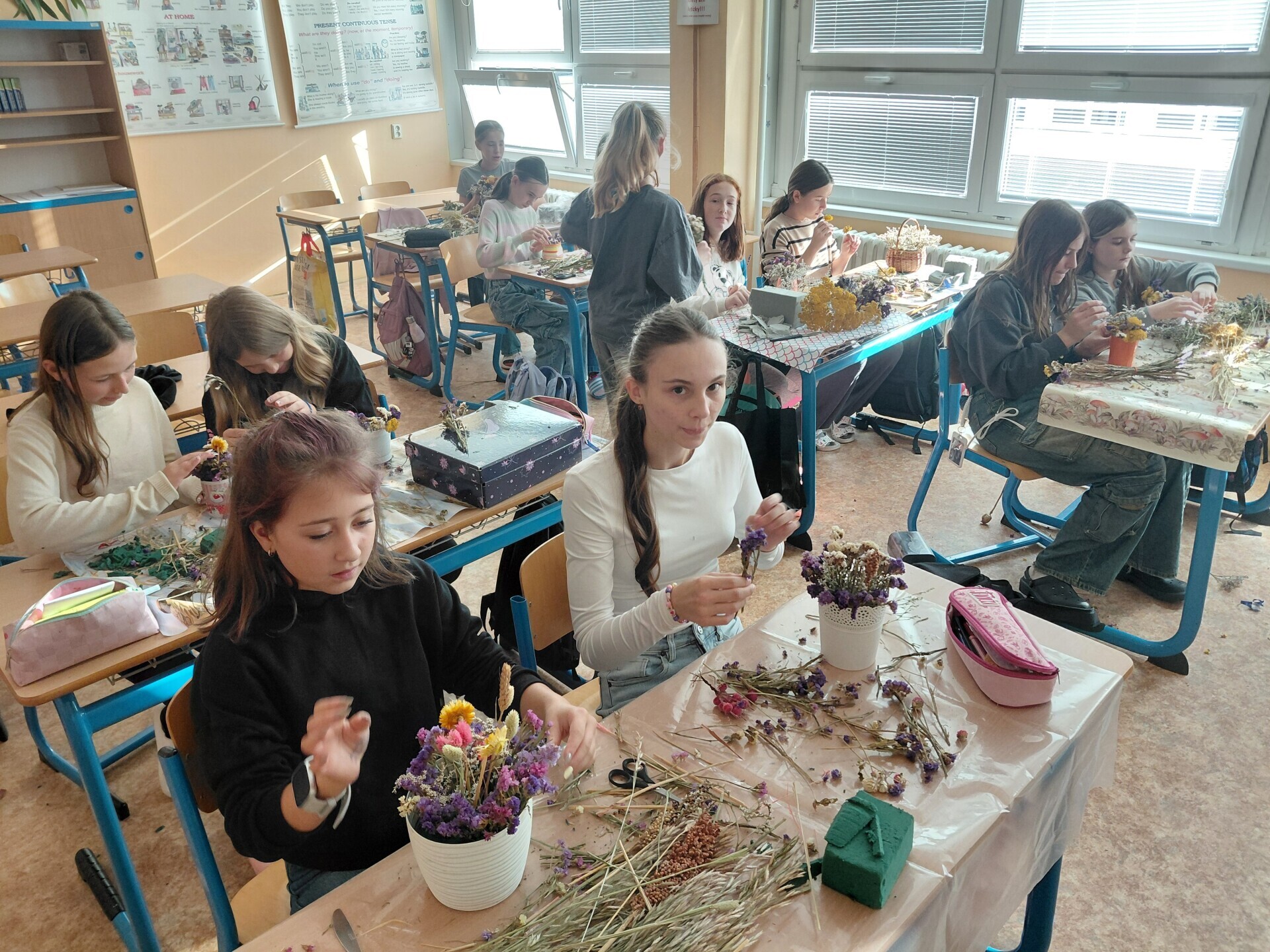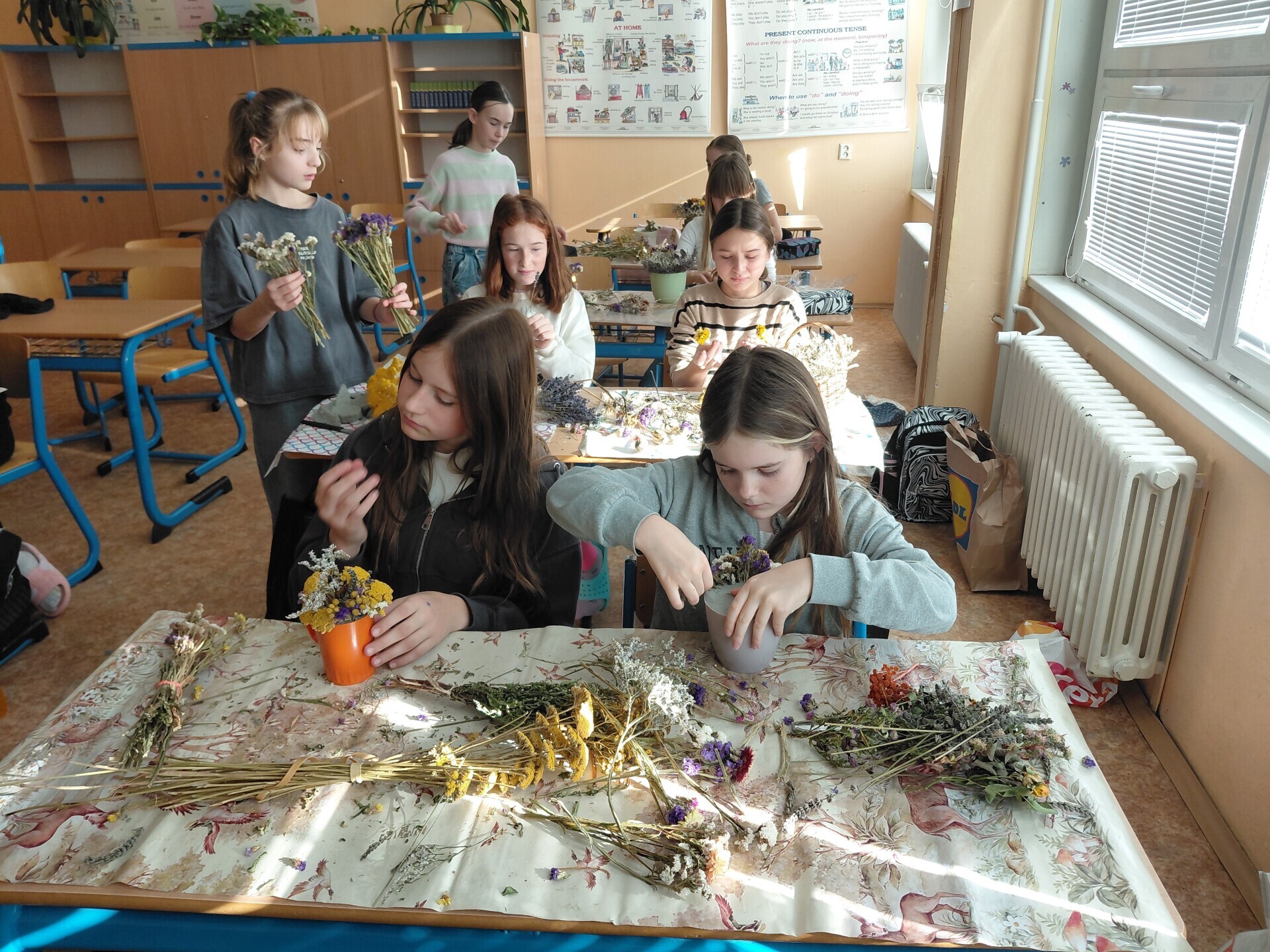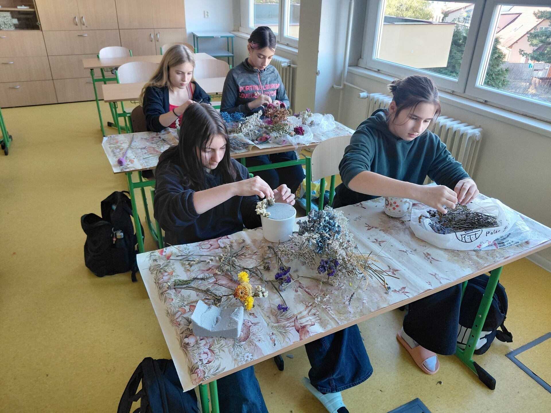 Během listopadu se děti v hodinách pěstitelství učily aranžovat sušené květiny. Seznámily se s druhy vhodnými k aranžování a s principy aranžování. Povedly se jim pěkné aranže tzv. suché vazby. LB